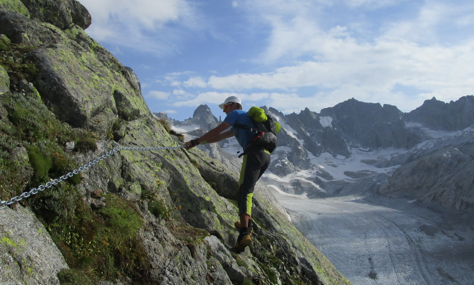 Normálnym turistickým tempom výstup od chaty na vrchol Monte Rosso trvá dve hodiny a prekonáte pri ňom cca 600 výškových metrov. Od chaty začínam klesať chodníčkom najprv mierne dole. Neďaleko vidieť veľkú ľadovcovú jaskyňu. Traverzujem ľadovcom vyhĺbenú dolinku a začínam stúpať miernym traverzom. Čoskoro začínajú prvé reťaze. Je ich tu požehnane ale vďaka nim už nie je potrebné ďalšie značenie a človek vie, že v prípade dažďa by nemal problém sa po žulových platniach vrátiť naspäť.