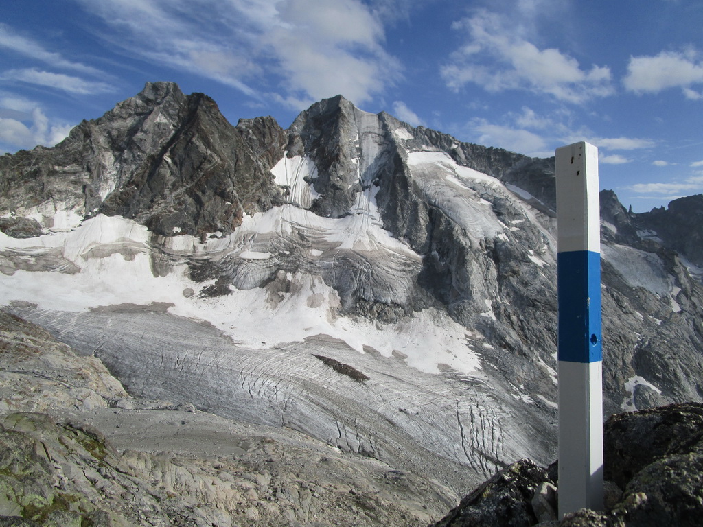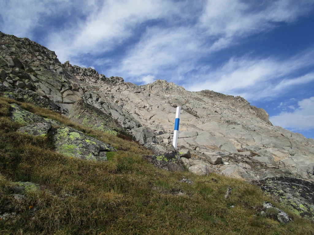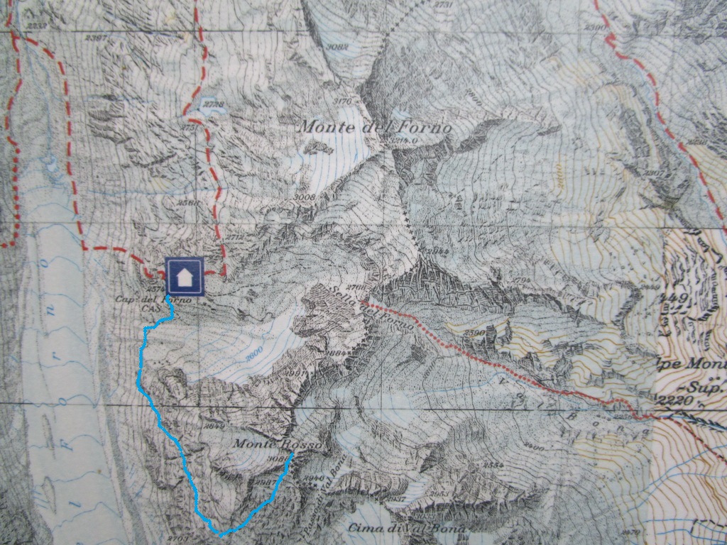 Už pri nedávnej návšteve na chate Forno som sa dozvedel že chatár Beat sa po preznačení modrej trasy na pass Casnil Sud pustil aj s priateľmi do budovania úplne novej modrej trasy na vrchol Monte Rosso. Modrá značka znamená v týchto končinách vysokohorskú trasu ktorá nie je špeciálne upravovaná a turisti sa na nej pohybujú na vlastné nebezpečenstvo. Pri ďalšej návšteve som prišiel na chatu až o tretej poobede ale to mi nevadilo aby som nevyskúšal len pred pár dňami dokončenú trasu.