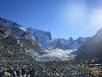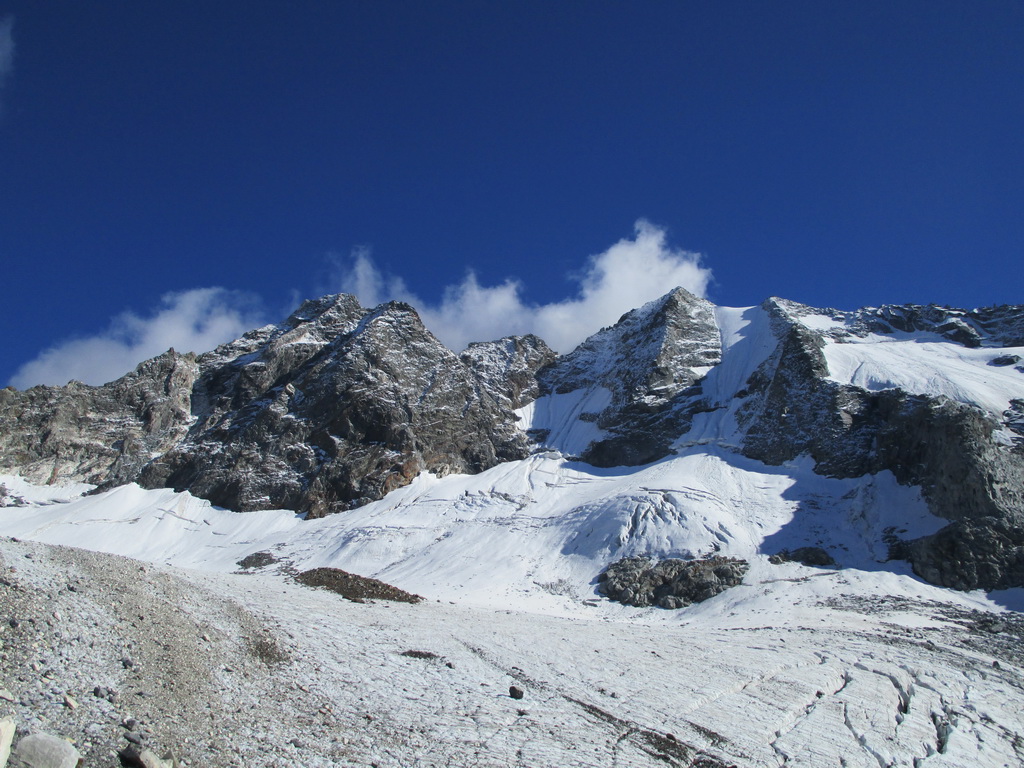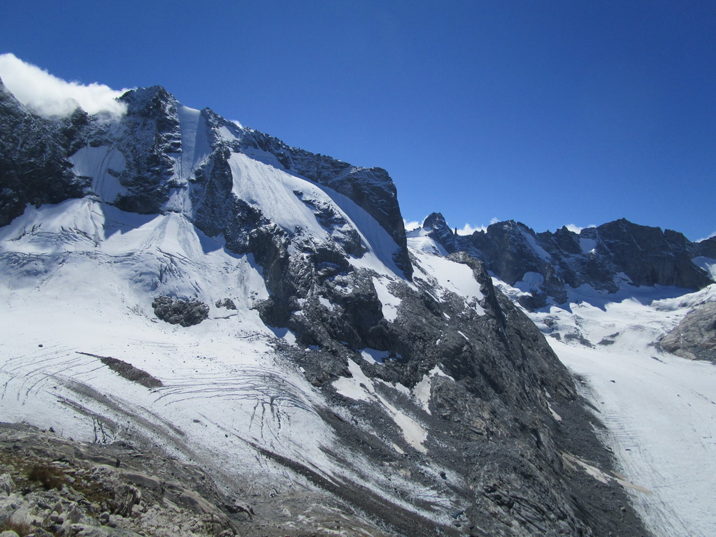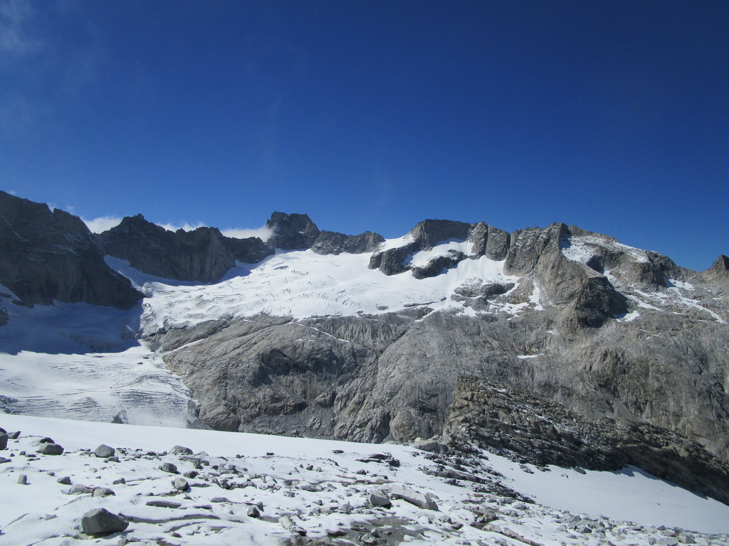 Snežilo len nedávno a tak sa s pribúdajúcou výškou dostávam do terénu kde na skalách leží čerstvý sneh. Prekonávam aj ten a už sa blížim ku ľadovcu.