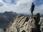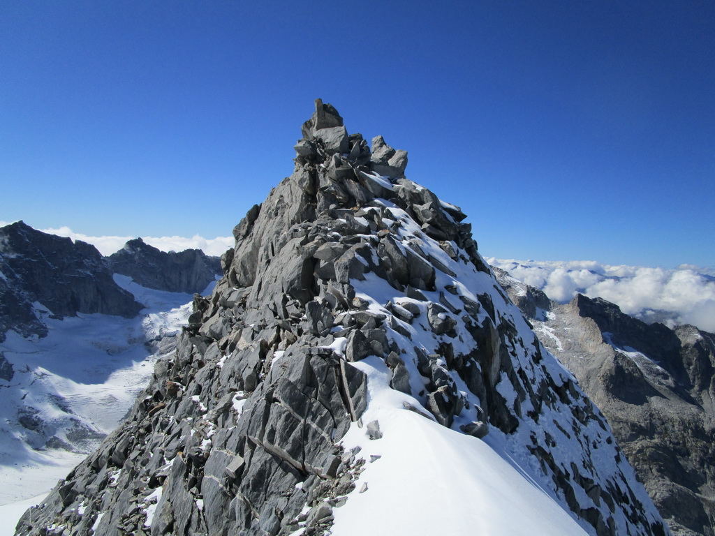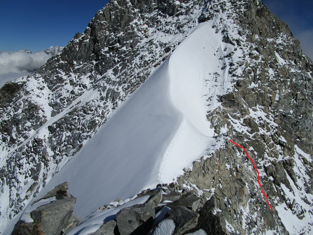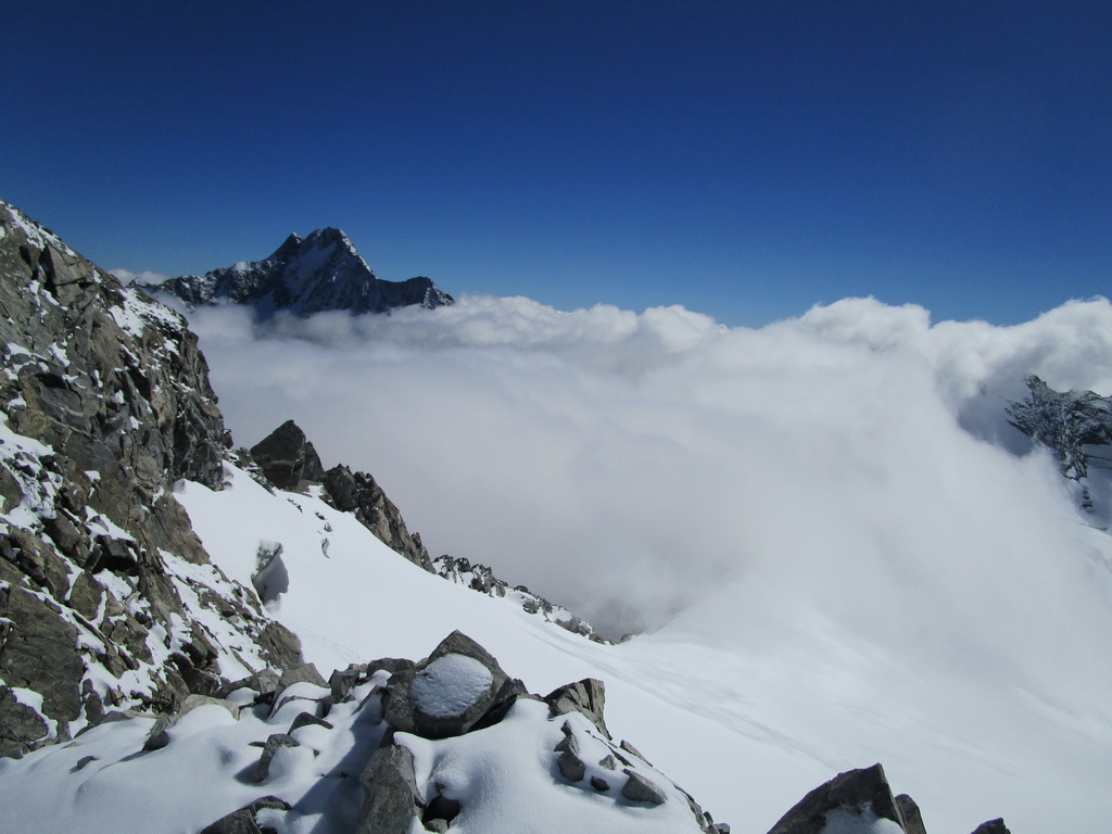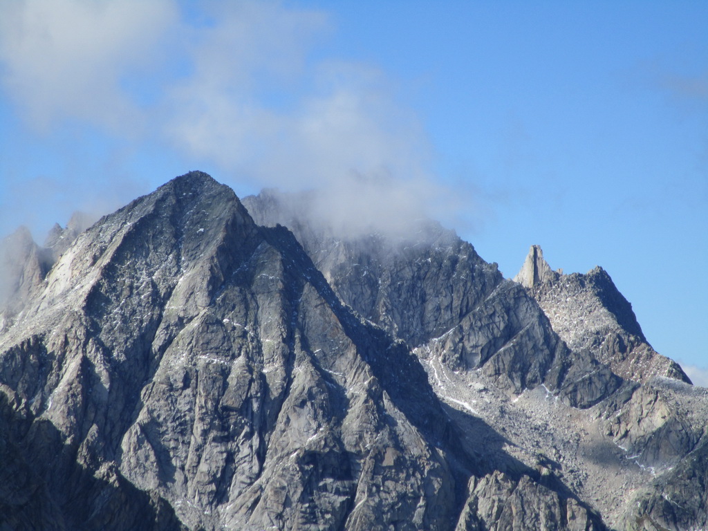 Skalný terén na okraji žľabu je plný voľných skál. Veľmi nepríjemný terén. Pri postupe hore sa silno zamýšlam ako to pôjde dole. Vychádzam do sedla ktoré končí nad severnou stenou. Ešte pred chvíľou som sa do nej pozeral zdola a z druhej strany. Počasie mi praje a náznaky hmly sa rozplynú. Úžasné výhľady.
