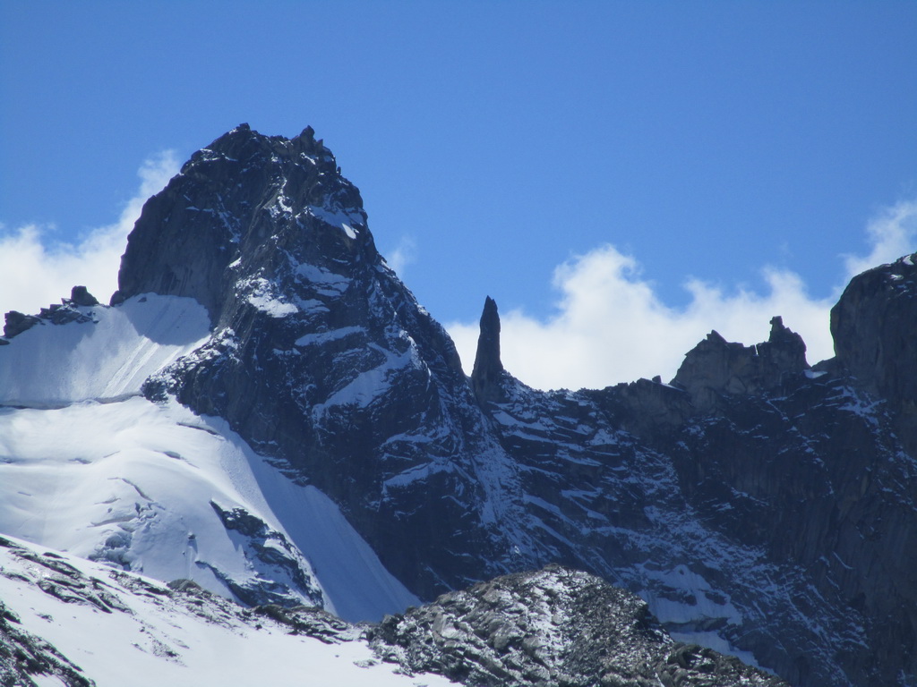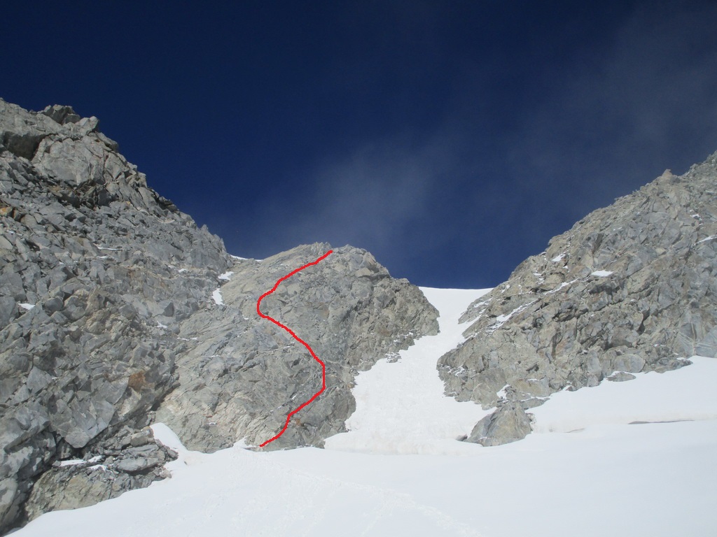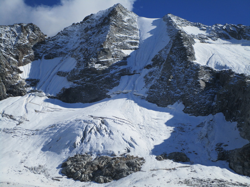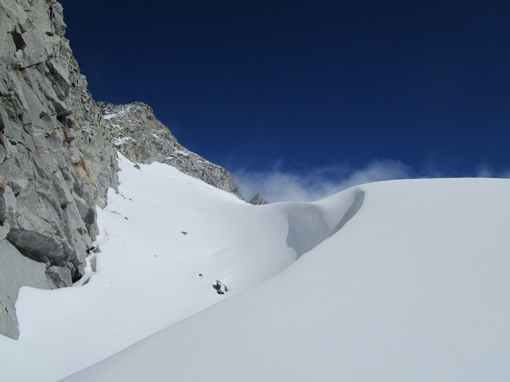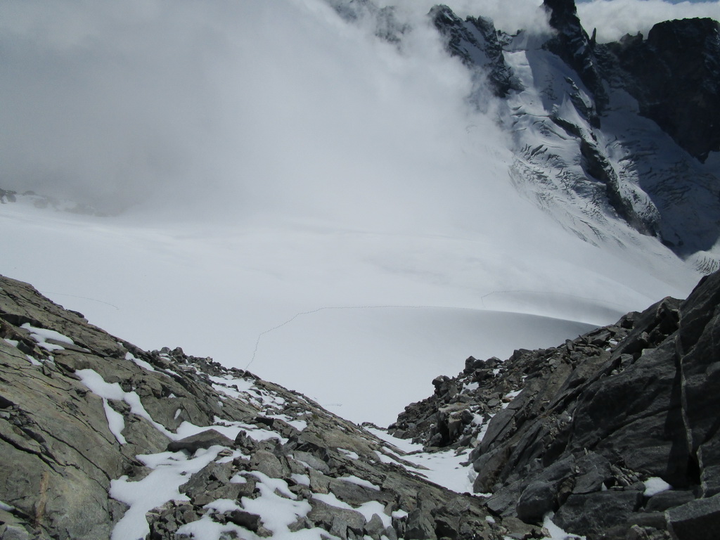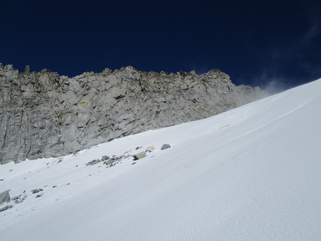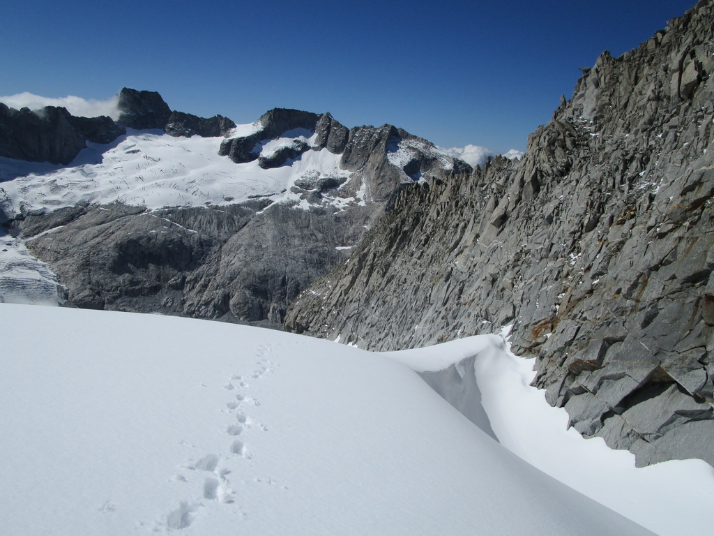 Monitorujem situáciu a nachádzam možný smer postupu. To už mám na teniskách nasadené mačiatka a návleky. Už po ľadovci sa dostávam ku skalnej stene. Trhliny tu nie sú, aspoň nič viditeľné. Po okraji ľadovca sa dostanem až pod žľab vedúci do sedla pod vrcholom. Čaká ma okrajová trhlina. Pustí ma...