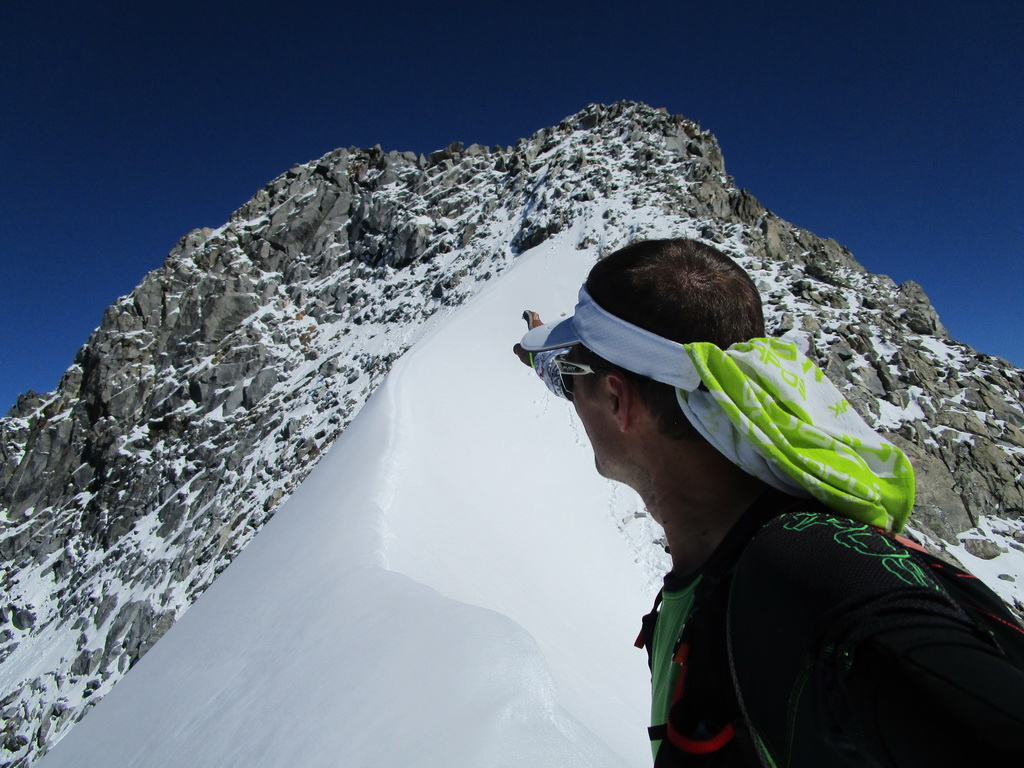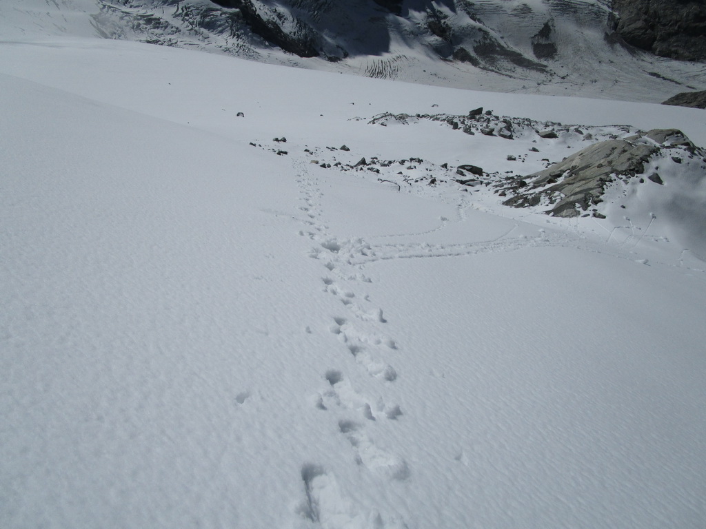 Na križovatke pod Monte Rosso odbočujem zo značky. Odtiaľto som už v pre mňa úplne novom teréne. Toto je presne to, čo mám rád. Následuje totálna improvizácia. Prebehnem cez ľadovec. Na týchto miestach trhliny nehrozia. Následuje spomínaný traverz. Vodorovný teda nie je.