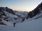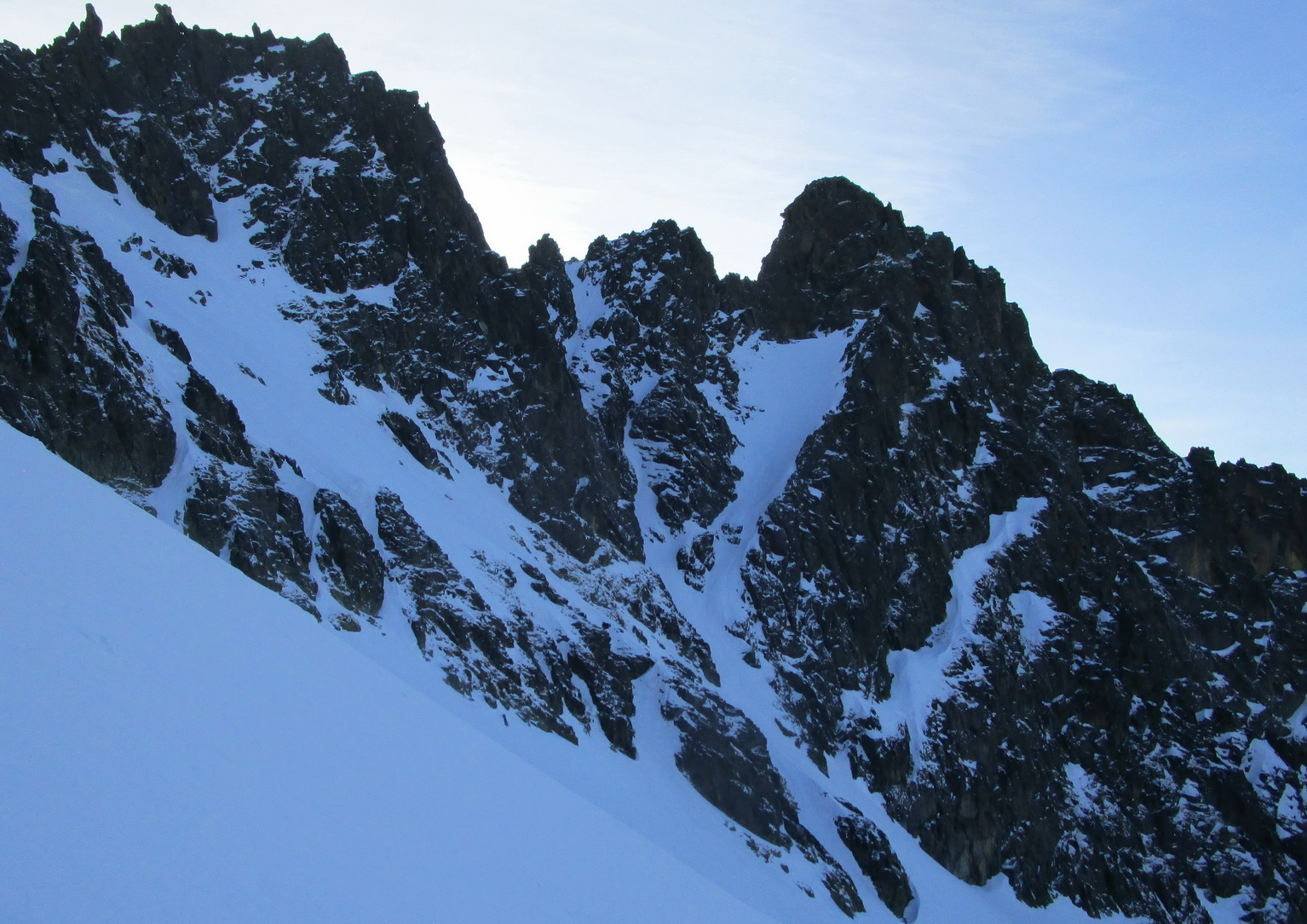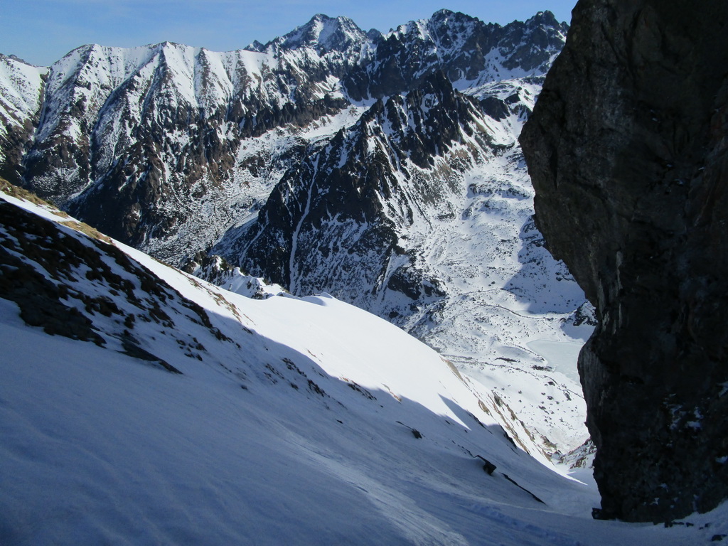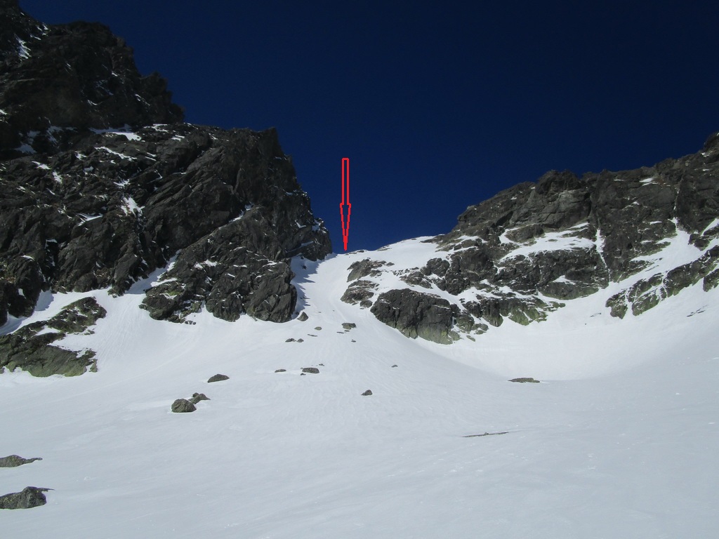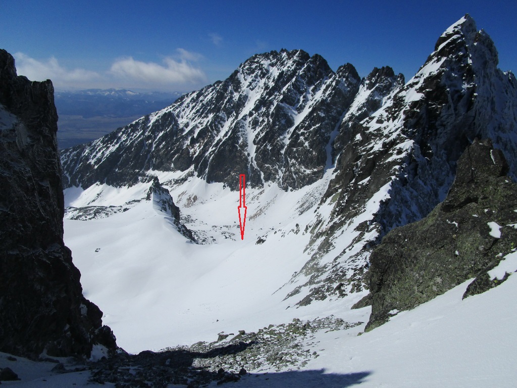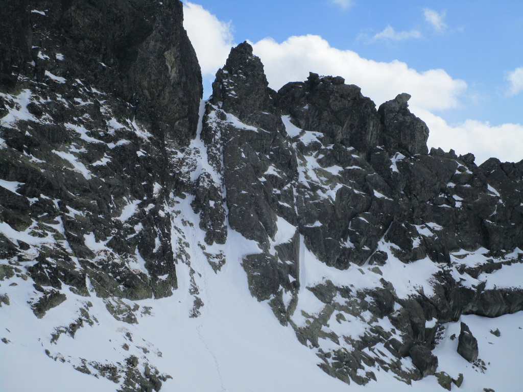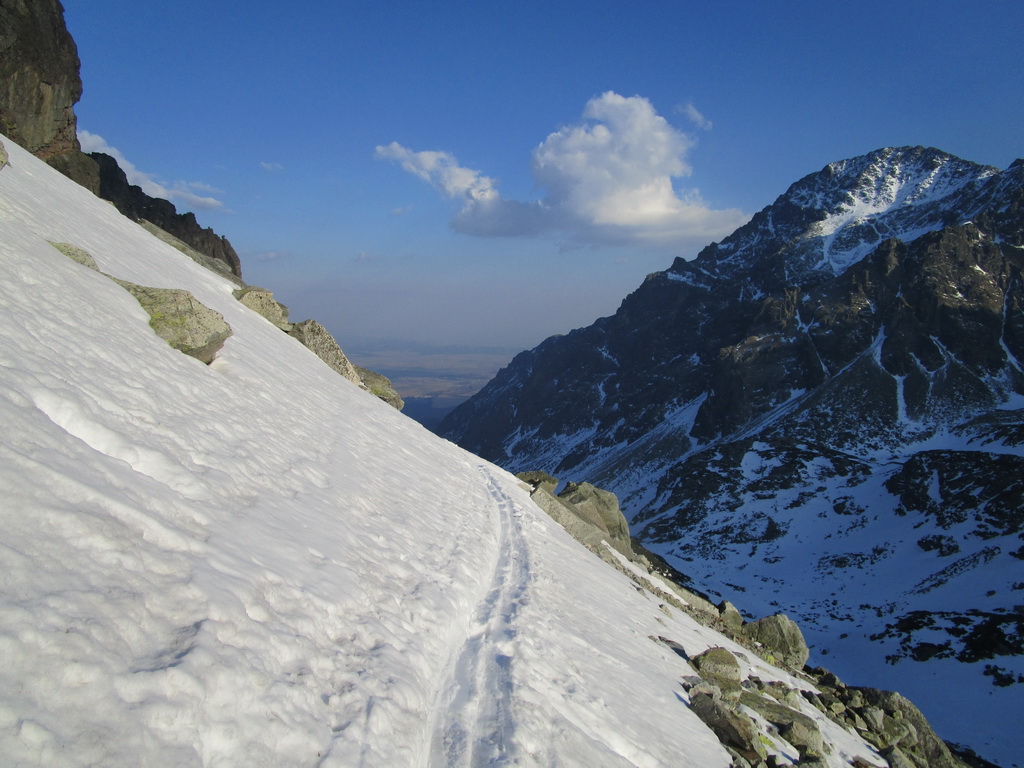 Zjazd z Batizovského je parádny firn. Už bolo načase sa nejako odmeniť. Namiesto vychutnávania si oblúčikov po dokonale rovnom svahu sa ale snažím traverzovať maximálne vysoko aby som ušetril každý možný meter. Do sedla vychádzam na mačkách a rovno začínam zostupovať na druhú stranu. V zostupovom žľabe sú našťastie dobré stopy tak postupujem rýchlo až kým sa nedostanem ku vodnému ľadu v spodnej časti. V piatok som tu delikátne zliezal ale teraz pozerám že niekto tu vysekal parádne stupy. Dík.