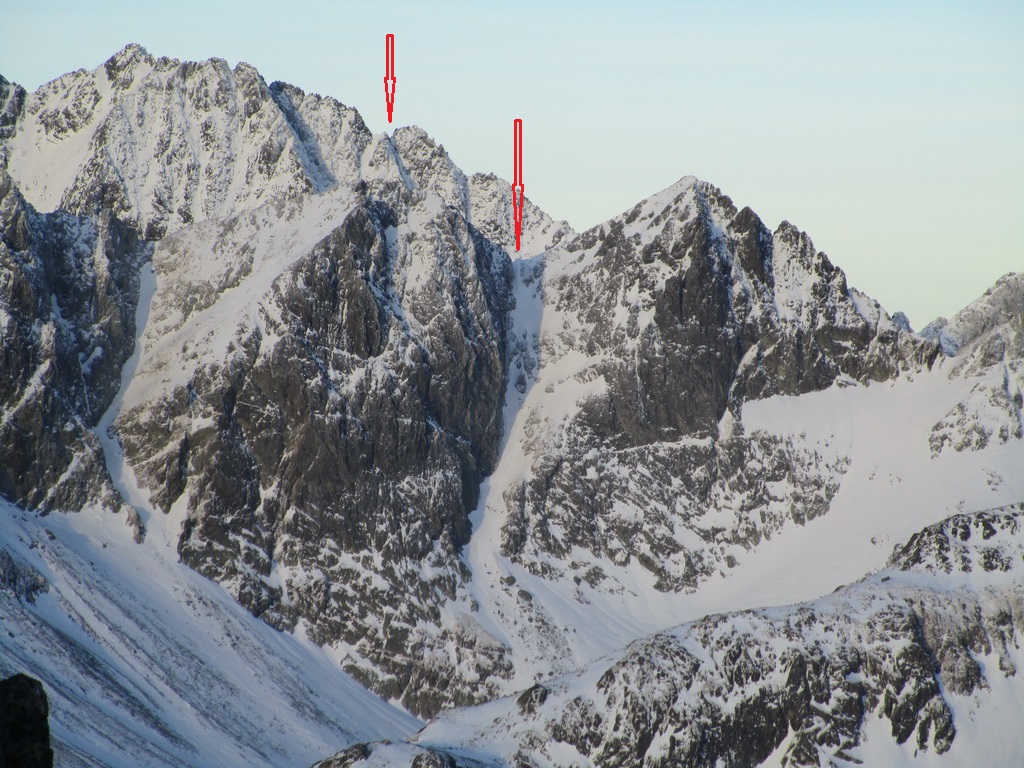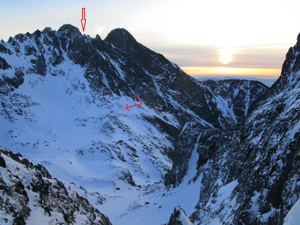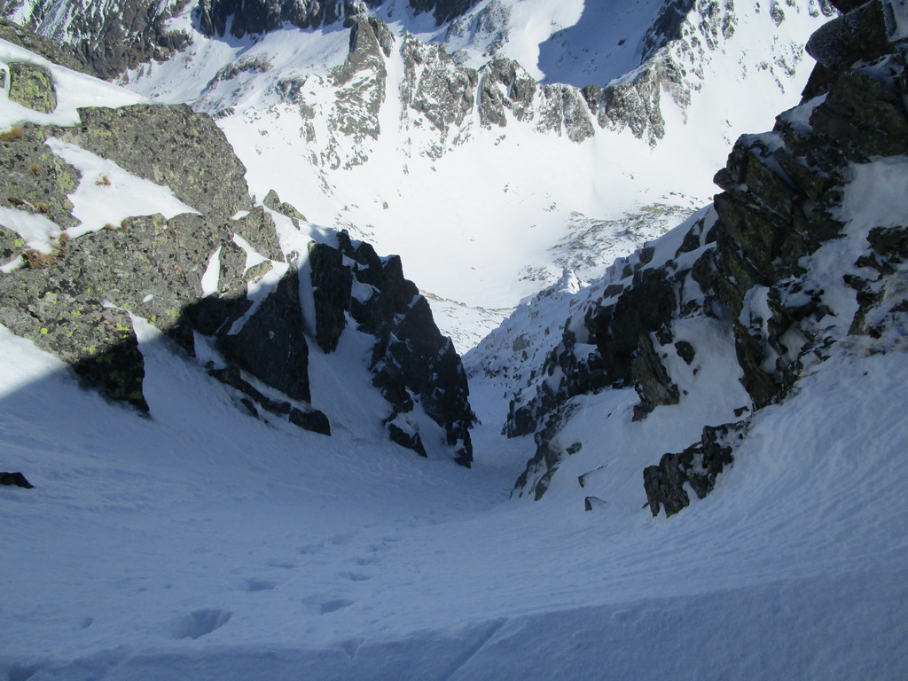 Super stopa pod bránkou, dnes už viem že to bola partia Roba Gálfyho ktorá tu deň predo mnou dala tiež parádny okruh. V hornej časti už je komín bez snehu. Nebyť fixu bolo by to slušné lezenie. Problém je ale, že fix je predratý viac ako do polovice. Prichytávam sa ho úplne jemne a snažím sa neťahať. Zliezanie na druhú stranu už mám nacvičené a o chvíľu šlapem ku